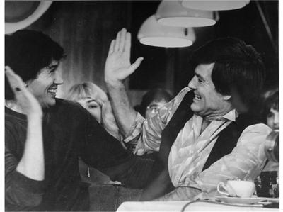 | Бисер Киров с Митка, Мишо и Милена Моллови (вляво) на оная паметна вечер в зала "България" през 1966 г., когато Морис Аладжем го чува |